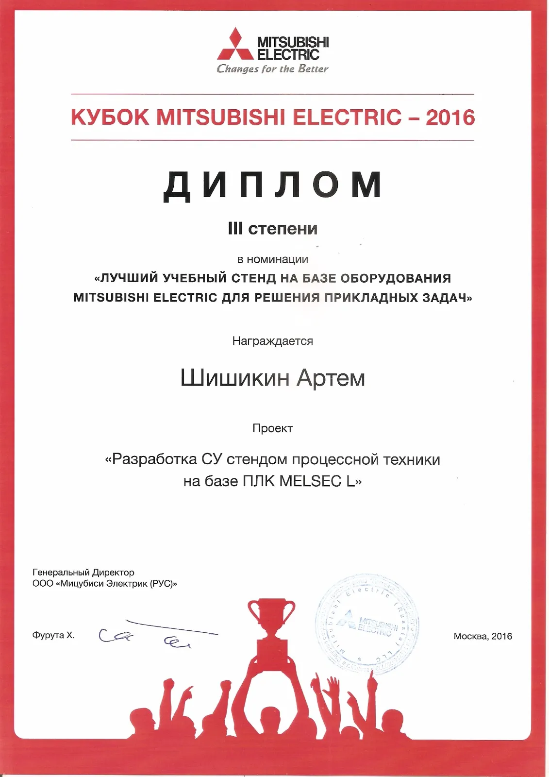 Магистрант 1-го курса Факультета энергетики, автоматики и телекоммуникации КарГТУ Шишикин Артем в творческом конкурсе «Кубок Mitsubishi Electric — 2016» , проходившем в Москве, занял 3 место в номинации «Лучший учебный стенд на базе оборудования Mitsubishi Electric для решения прикладных задач». Проект молодого ученого «Разработка СУ стендом процессной техники на базе ППК MELSEC L» был подготовлен под руководством заведующего кафедрой автоматизации производственных процессов, профессора Брейдо И.В.