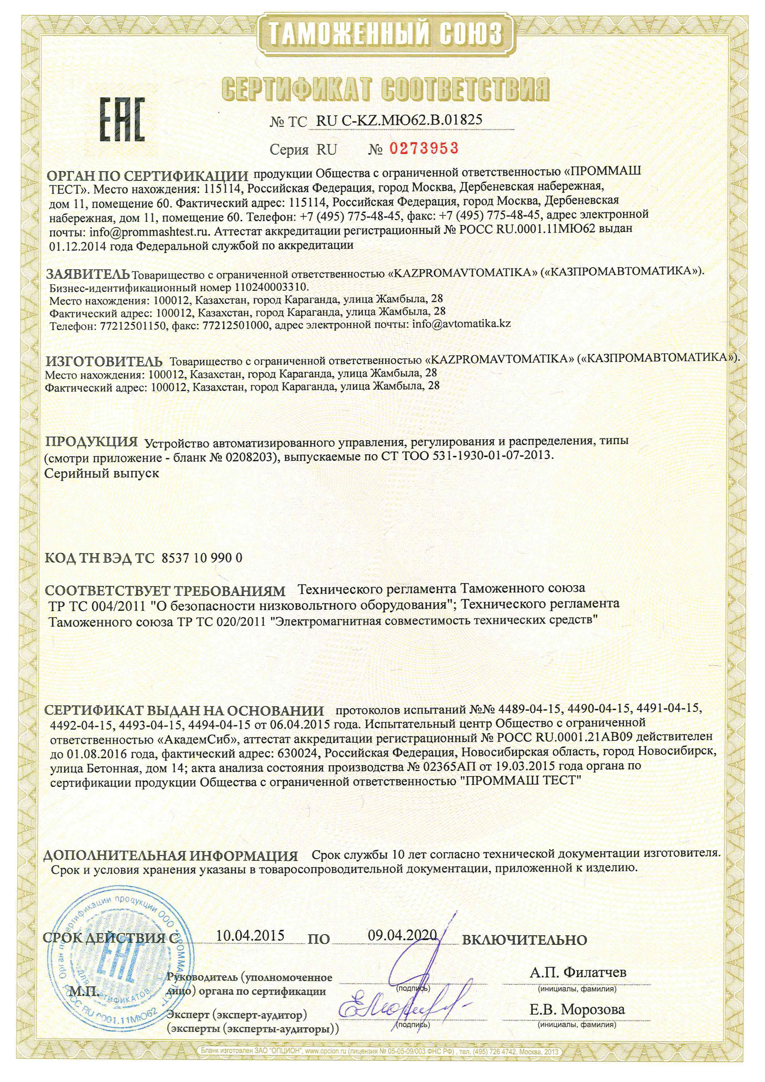 Уважаемые партнеры, наша компания рада сообщить Вам о получении сертификата соответствия таможенного союза на 15 видов электрических низковольтных устройств управления, регулирования и распределения собственного производства.