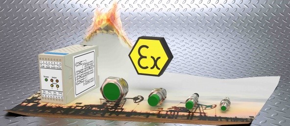 При использовании во взрывоопасной зоне индуктивный датчик подключается к системе управления через искрозащитный барьер. Отечественным устройством подобного типа является, например, "Корунд-М530". Вместо него может использоваться барьер и переключающий усилитель MC13-8Ex0-R/24VDC фирмы Turck или аналогичное устройство фирмы MTL.