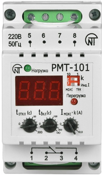 РМТ-101 предназначено для постоянного контроля действующего значения тока, потребляемого 1-фазной нагрузкой и ее отключения с помощью встроенного электромагнитного реле, управляющего внешним контактором, в случае превышения предельного уровня (МТЗ с независимой выдержкой времени). Токовые уставки, время срабатывания реле и время автоматического повторного включения (АПВ), определяет пользователь с помощью потенциометров, вынесенных на лицевую панель прибора.