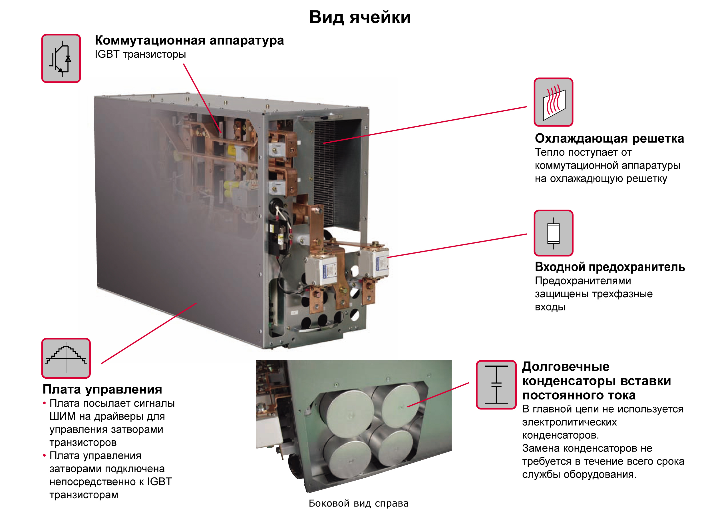 Высокий входной коэффициент мощности Каждая ячейка преобразователя имеет диодный выпрямитель, поэтому коэффициент мощности преобразователя более 95% в широком диапазоне регулирования. Такой коэффициент мощности сохраняется даже при управлении многополюсным асинхронным двигателем с низким коэффициентом мощности. Высокий коэффициент мощности не требует использования компенсирующих устройств. |