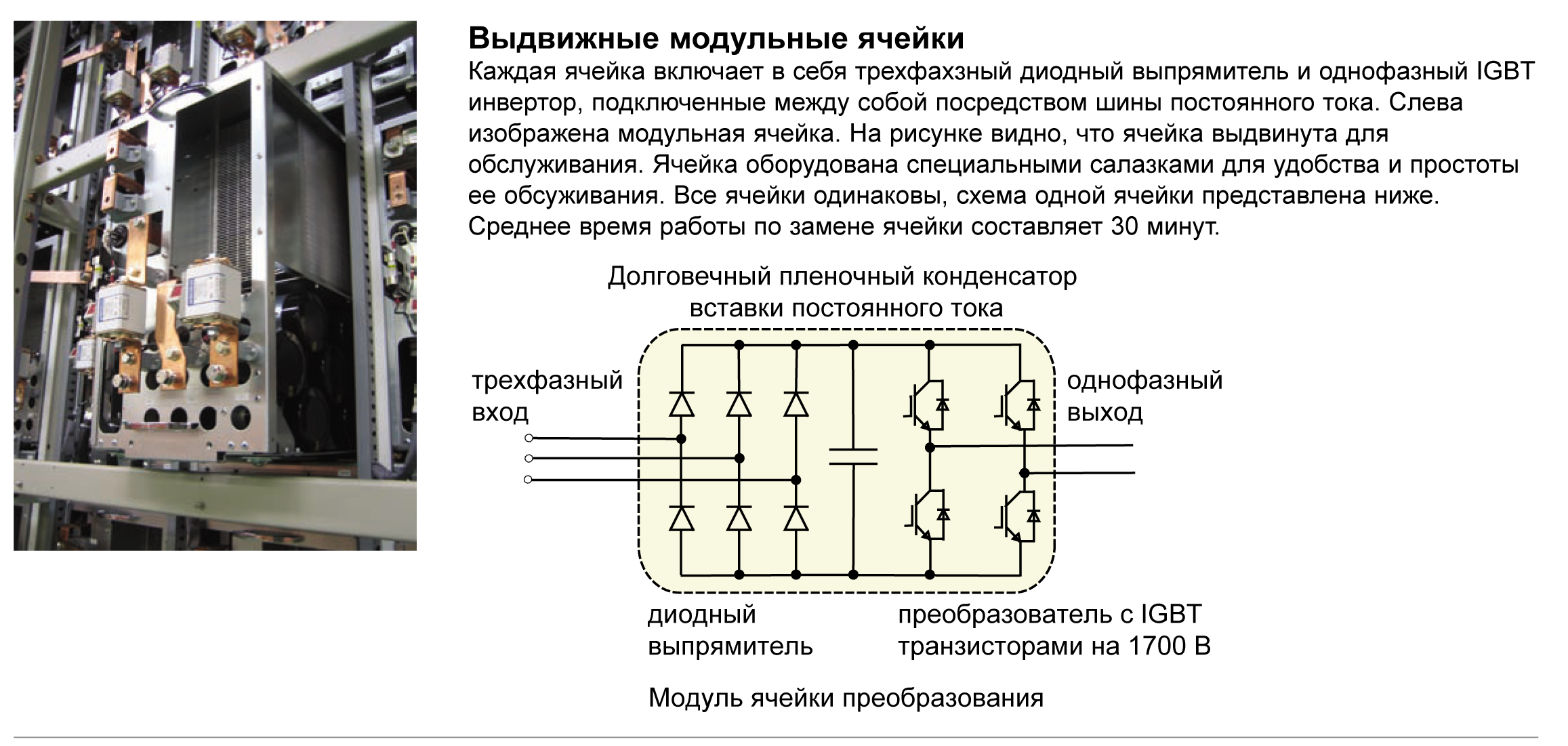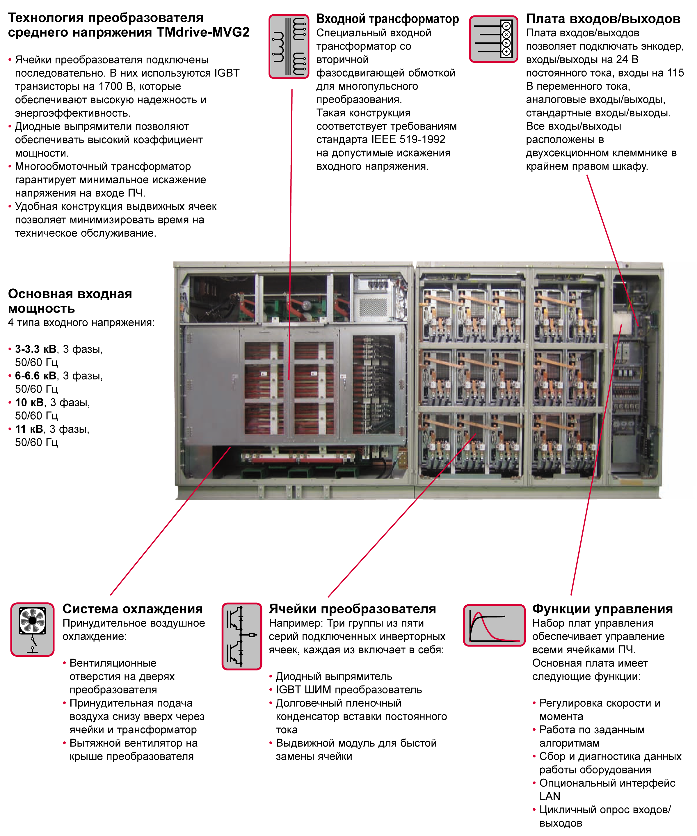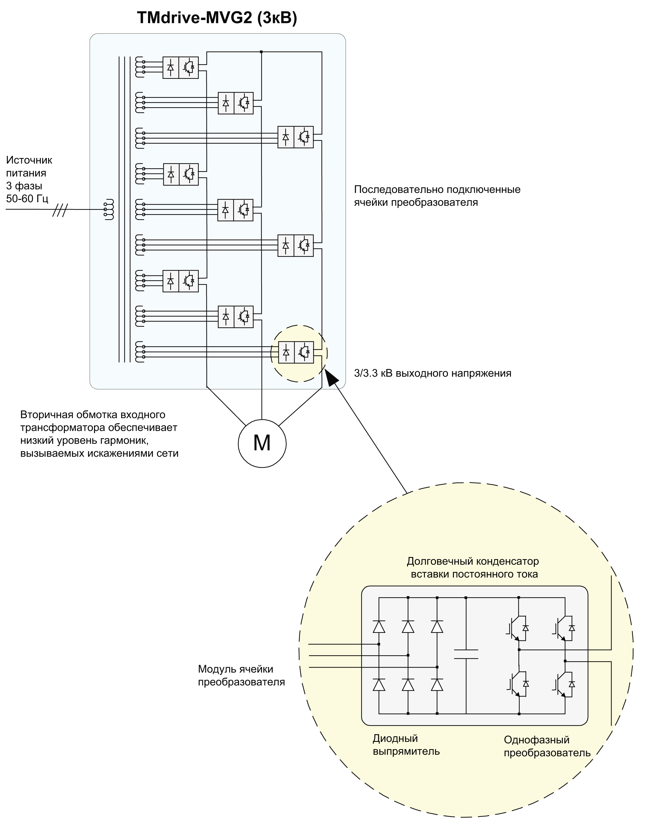 TMdrive-MVG2 состоит из входного трансформатора и инвертора. Инвертор состоит из отдельных ячеек. Для преобразователя на 3 кВ используется 3 последовательно соединенных ячейки для получения на выходе 7 уровней выходного напряжения.
