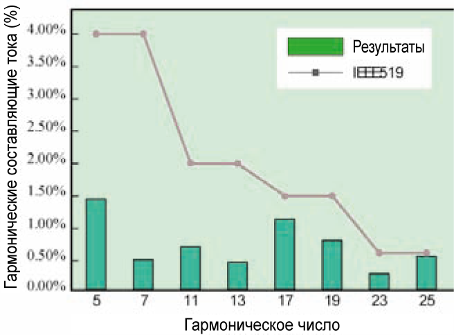 Синусоида на входе близка к идеальной Благодаря использованию многообмоточного трансформатора в преобразователе реализуется многопульсная схема выпрямления, что позволяет полностью соответствовать требованиям европейского стандарта IEEE 519 (1992). Использование такого оборудования позволяет снизить гармонические составляющие тока в сети и защитить другое периферийное оборудование. На рисунках представлены измерения гармоник при тестировании преобразователя на реальной нагрузке и сравнение с требованиями стандарта IEEE - 519 (1992). |